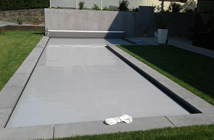 Die Folie wird mit einem Seil über das Wasser gezogen; die Aufwicklung erfolgt i.d.R. per Handkurbel oder auch per Knopfdruck (Halbautomatik).